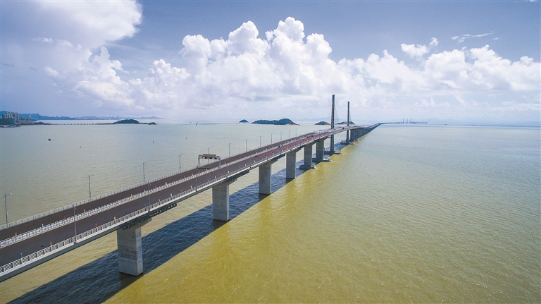 记者在现场看到,在伶仃洋海面上的港珠澳大桥,已建成两个面积为十万平方米的大型人工岛,与隧道、桥梁相连。据介绍,港珠澳大桥主体桥梁工程长约22.9公里,包括青州桥、江海桥、九洲桥三座通航孔桥和约20公里非通航孔桥,其中深水区15公里采用110米跨径钢箱连续梁桥,浅水区约5.4公里采用85米钢混组合连续梁桥。