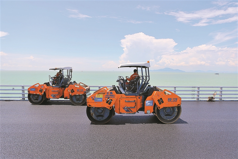 港珠澳大桥主体工程桥梁上部结构用钢量达42万吨,相当于60座埃菲尔铁塔或10座“鸟巢”。大桥桥面铺装规模达70万平方米,其中50万平方米为钢桥面,是目前世界最大规模的钢桥面铺装工程。桥面铺装层采用浇筑式+SMA沥青混凝土铺装方案,提出“露天工厂化施工”的理念,创建了世界一流的集料生产线,首次引进车载式抛丸机,研制了防水层机械化自动喷涂设备,大大提高了施工效率和质量。