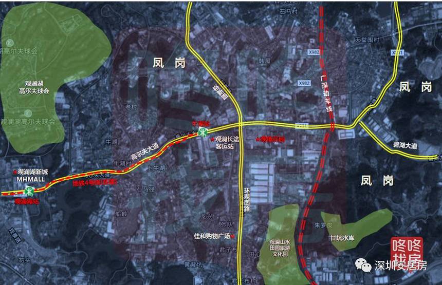 项目位于深圳边缘地带,距离建设规划中的地铁4号线“牛湖站”约2公里距离,不管是交通环境、居住环境还是区域价值,目前皆尚处于低位。距离最近的商业配套为观澜湖新城MH MALL,沿高尔夫大道距离4公里。