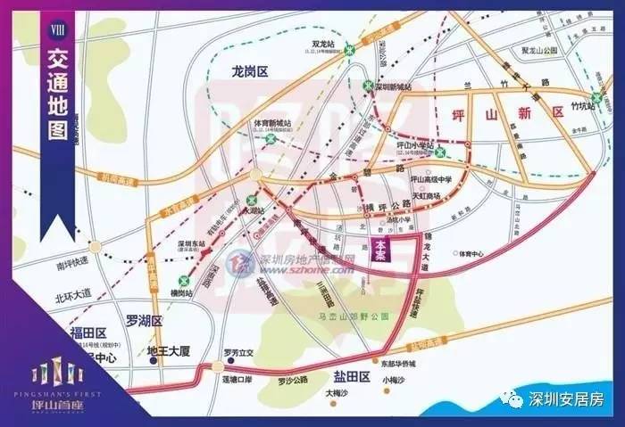 项目近邻汤坑三路,周边主要街道有:同裕路、同富路、汤坑路、坪山黄竹坑路。周边拥有深汕公路、横坪快速干道、锦龙大道,拟建设中的南坪快速三期与市区紧密相连,大大缩短本项目与市区之间的通达时间。坪盐路已立项,项目与盐田未来10分钟可通达。