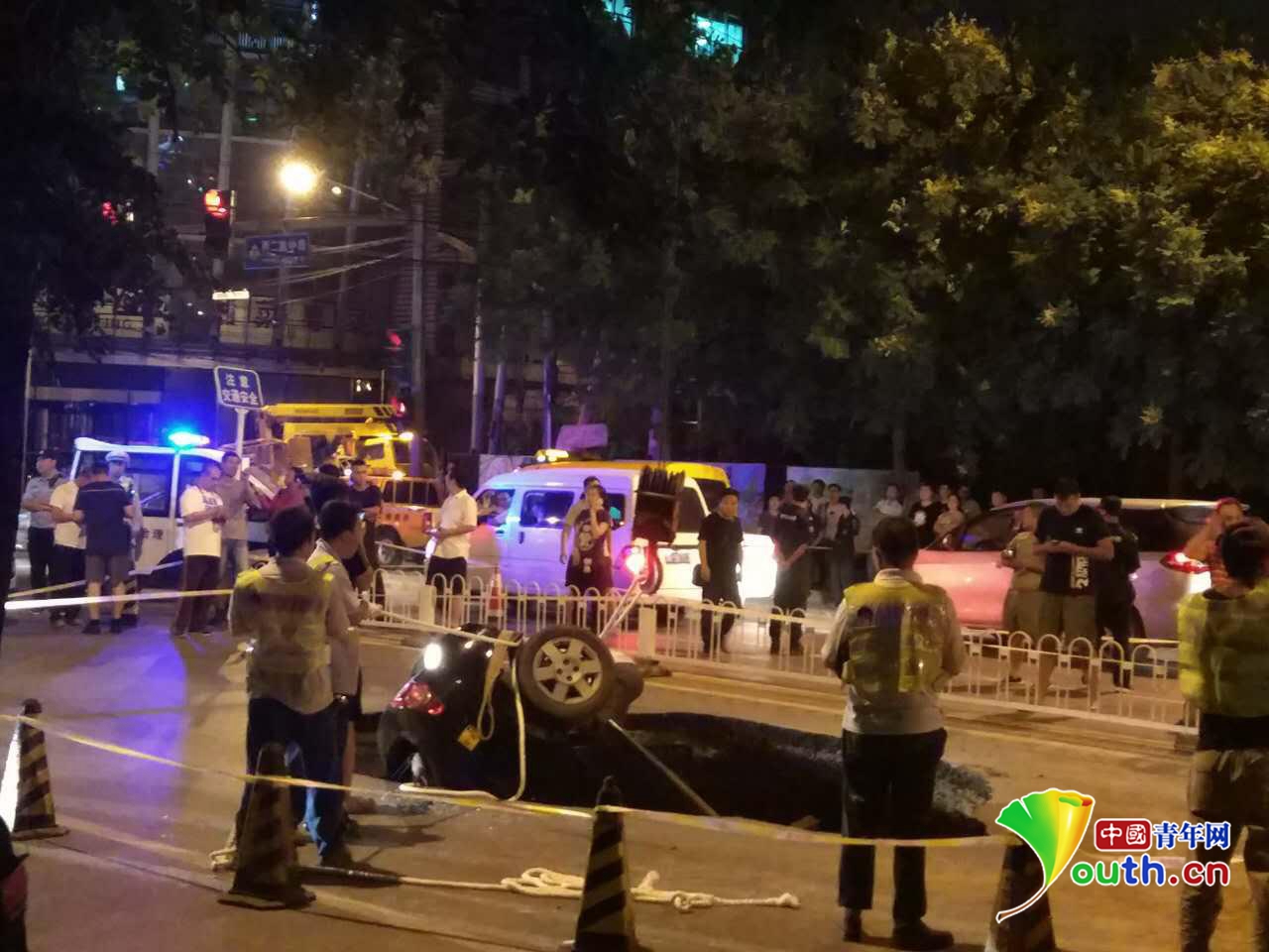 中国青年网记者晚10时许到达现场,记者在现场看到坍塌路段已被警方封闭,现场周围停有多辆警车和消防救援、市政工作车辆。路面塌陷形成了七八平米的大坑,一辆黑色小轿车翻倒在坑内。现场的市政、消防等部门人员正在实施救援。