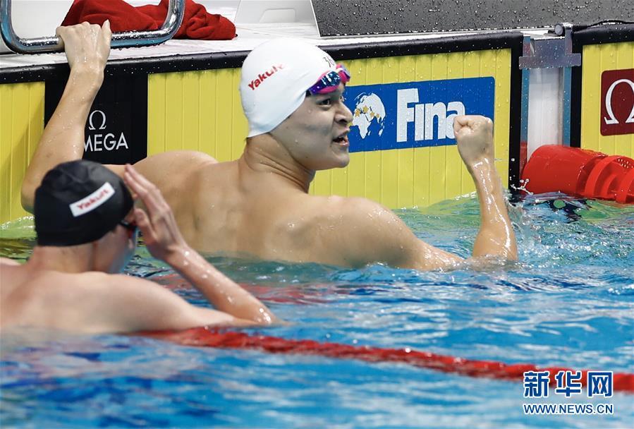7月25日,孙杨(后)在决赛后庆祝。当日,在匈牙利布达佩斯进行的第17届国际泳联游泳世锦赛游泳男子200米自由泳决赛中,中国选手孙杨以1分44秒39的成绩夺冠。新华社记者丁旭 摄