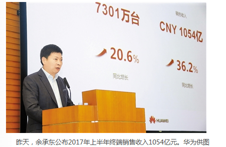 值得注意的是,华为消费者业务在上半年获得持续增长。在昨日下午举行的消费者业务发布会上,余承东称,终端销售收入1054亿元人民币,在三大业务中占比达到37.2%,同比增长36.2%,智能手机发货量7301万台,同比增长20.6%。