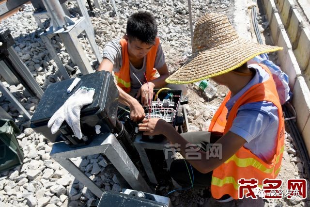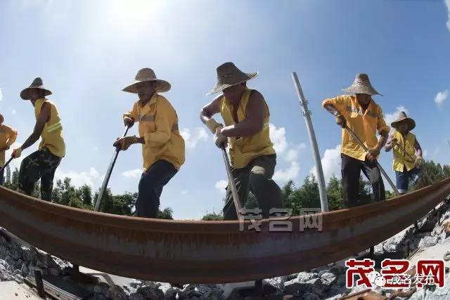 日前,记者跟随深茂铁路轨道车从电白区羊角镇制梁场向阳江方向见证茂名段建设情况。在艳阳的照射下,两双笔直的钢轨在光亮的碎石上向东延伸,望不到尽头,两旁已装有高压线杆,工人们穿着黄色的工作服正冒着烈日,汗流浃背地对铁路轨道进行线路稳定、安装信号灯、 做防护栏 、电缆槽等。近上午11时,轨道车穿过望夫河大桥,只见那里的铺轨作业人员正用钢钎对500米长轨进行入位、倒固等,在火辣辣的太阳下,有条不紊地工作着。深茂铁路项目领导对酷热天时奋战在一线的工作人员表示关切和赞扬,并提出一定要注意生产安全,大热天时,严防中署等。