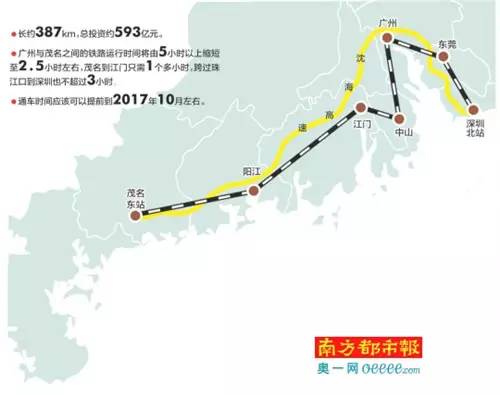 据了解,深茂铁路东起深圳北站,途经东莞、广州、中山、江门、阳江,西止茂名东站,正线全长388公里,分江门至茂名段、深圳至江门段两期建设。