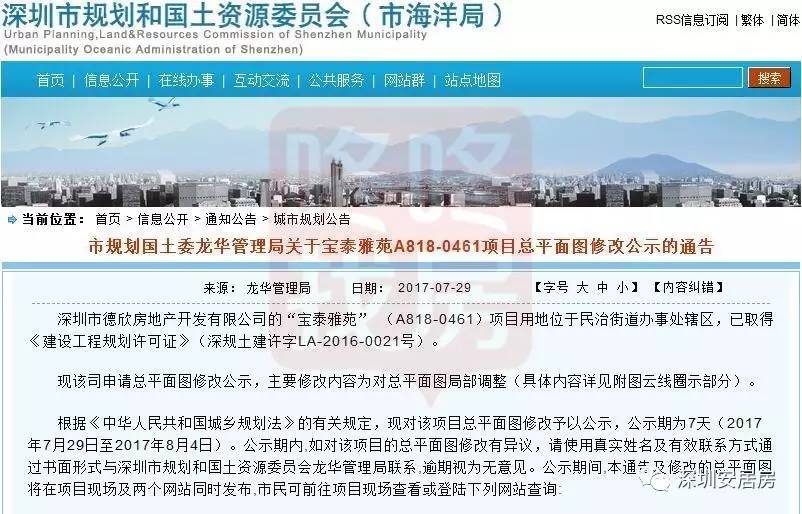 市规划国土委龙华管理局关于宝泰雅苑A818-0461项目总平面图修改公示的通告