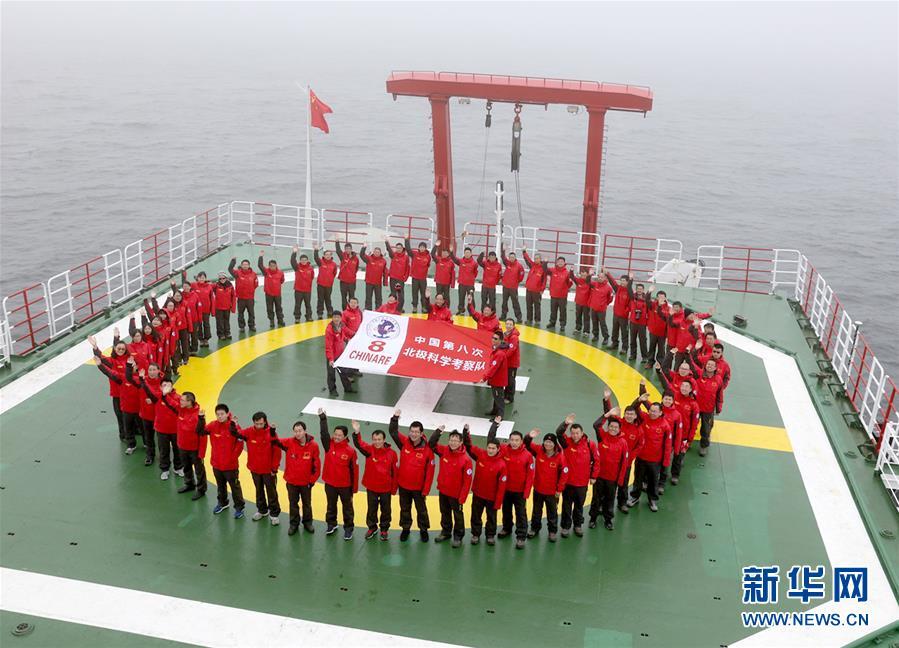 7月31日,科考队员在“雪龙”号上围成圆圈合影。