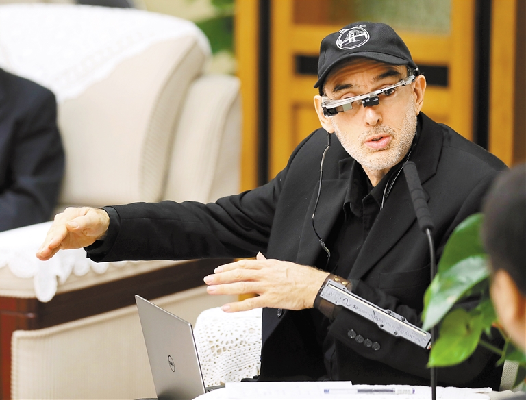 昨日,斯蒂夫·曼在市民中心接受记者采访。他戴着一副智能眼镜,手腕上是一块可显示电磁波强度变化的设备。 深圳商报记者 钟华登 摄