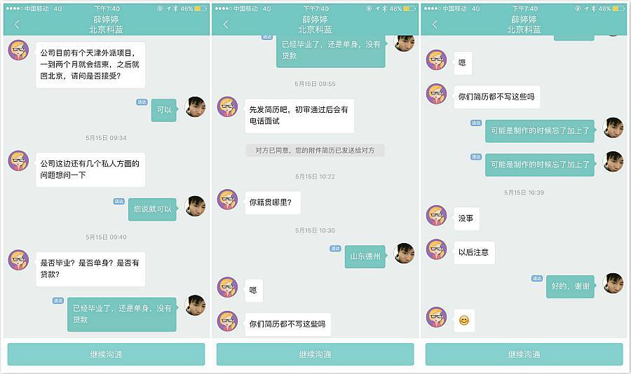 李文星与薛婷婷在BOSS直聘上的聊天记录。