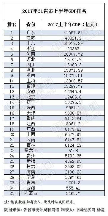 从31省市上半年GDP数值变化来看,前三名全部为东部沿海地区,分别是广东、江苏、山东,上半年GDP总额为41957.84亿元、40821.2亿元、35017.39亿元。
