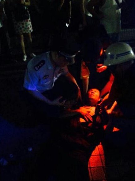 图为辅警因体力不支晕倒现场