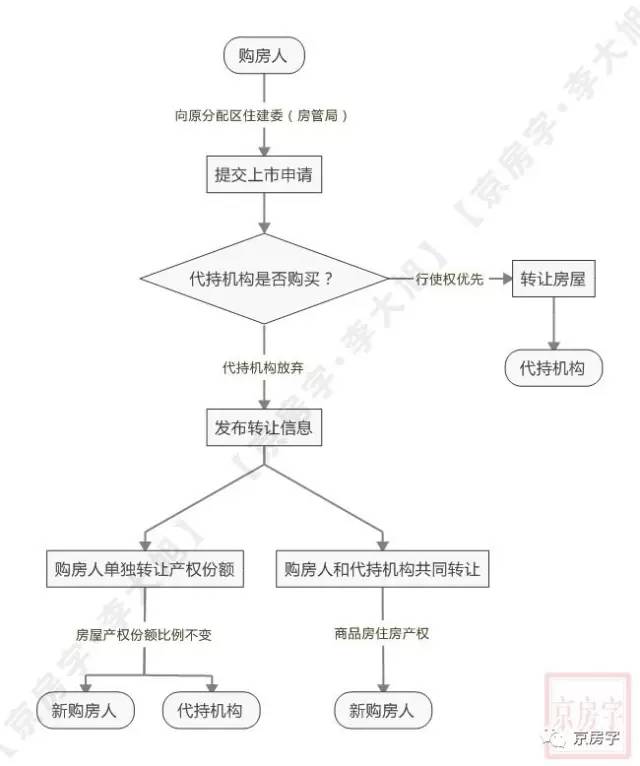 1、购房人向原分配区住建委(房管局)提交上市申请,明确出售价格。同等价格条件下,代持机构可优先购买。