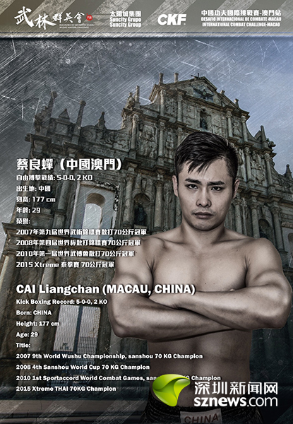 深圳新闻网讯(记者 王志明)期待已久的武林盛事——“2017澳门武林群英会”8月10日正式揭幕,作为“2017澳门武林群英会”重头戏之一的“CKF中国功夫国际挑战赛”,同日在澳门塔石体育馆巅峰对决,将有10场中外名将同场较量,其中北京奥运会散打冠军蔡良蝉出战格外引人注目,他将和泰拳王阿敏(Armeng)一决高低,剑指金腰带。