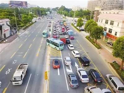 坪山大道与行政八路交界路口,7:30-21:00期间,当左转待转信号灯的绿灯放行时,车辆可依次进入借道左转车道进行左转弯。这是坪山交警通过科技手段治堵又一微创新应用。