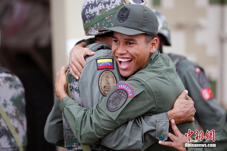 委内瑞拉参赛队队员拥抱庆祝队友打中靶标。