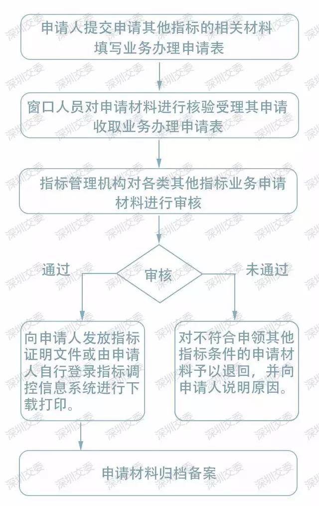 小汽车其他指标的申请,只能通过窗口办理(深圳市福田区深南大道8001号福安大厦西北座三楼),流程如下: