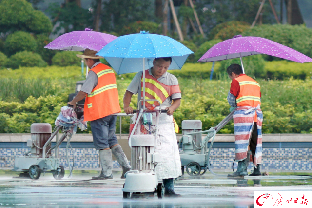 2017年7月29日,广州海心沙,工人在特制的遮阳伞下打磨音乐喷水池的地面。