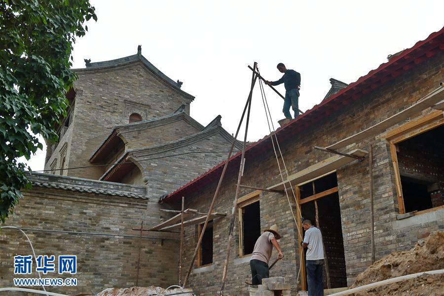 工人在修缮山西省沁水县湘峪古堡内的建筑(8月3日摄)。 3年前,近400岁的明代湘峪古堡人去堡空、房屋破败。如今,它以另一种形式“活”起来。湘峪古堡位于山西省沁水县,中空的古城墙、绿莹莹的护城河、中西合璧的民居、全国罕见的“双插花院”,让它显得格外神秘。新华社记者 曹阳摄