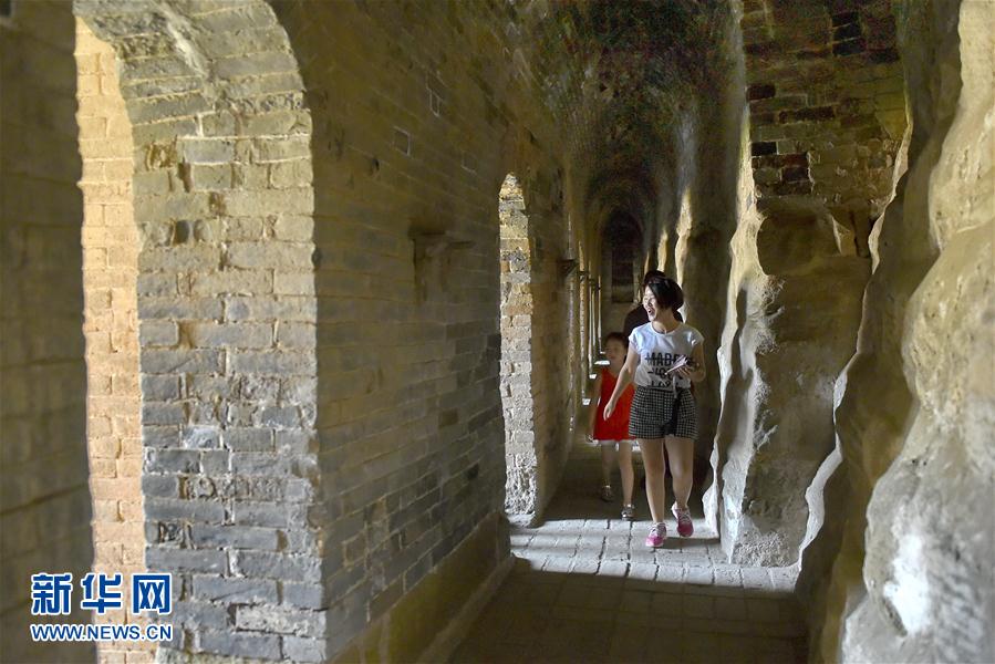 游客在山西省沁水县湘峪古堡城墙中的窑洞内游玩(8月3日摄)。 3年前,近400岁的明代湘峪古堡人去堡空、房屋破败。如今,它以另一种形式“活”起来。湘峪古堡位于山西省沁水县,中空的古城墙、绿莹莹的护城河、中西合璧的民居、全国罕见的“双插花院”,让它显得格外神秘。新华社记者 曹阳摄