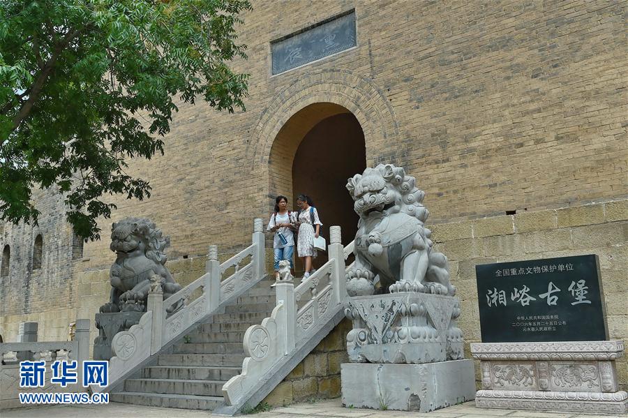 这是8月2日拍摄的山西省沁水县湘峪古堡的城门。 3年前,近400岁的明代湘峪古堡人去堡空、房屋破败。如今,它以另一种形式“活”起来。湘峪古堡位于山西省沁水县,中空的古城墙、绿莹莹的护城河、中西合璧的民居、全国罕见的“双插花院”,让它显得格外神秘。新华社记者 曹阳摄