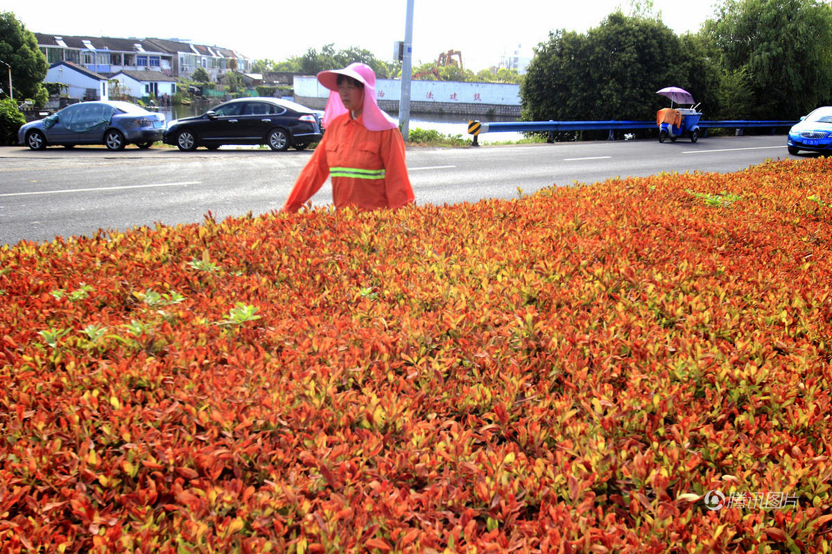 7月31日,浙江绍兴市区二环北路、迪荡湖边,许多绿化带植物(杜鹃花)的树叶在长期高温炙烤下,逐渐变成红色,有点甚至枯焦。瑞昌/视觉中国