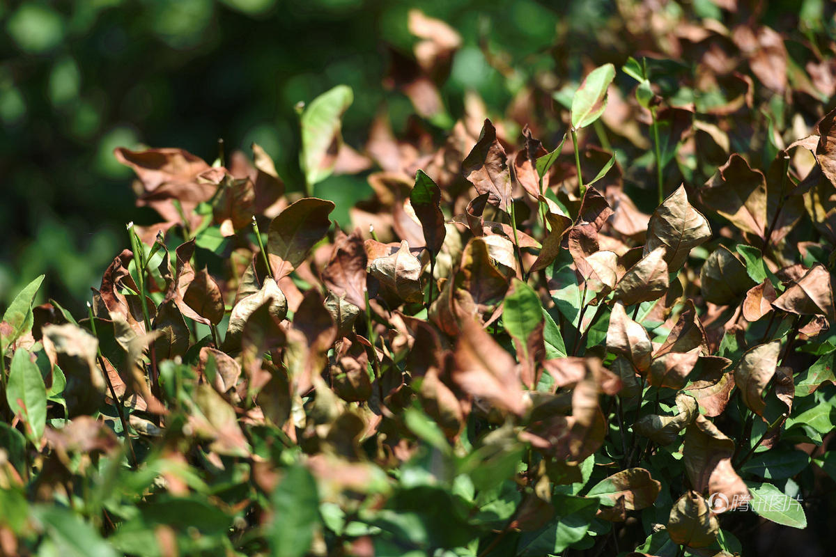 8月7日,在杭州西湖龙井一级保护区里,被高温酷暑烤焦的西湖龙井青叶。龙巍/视觉中国