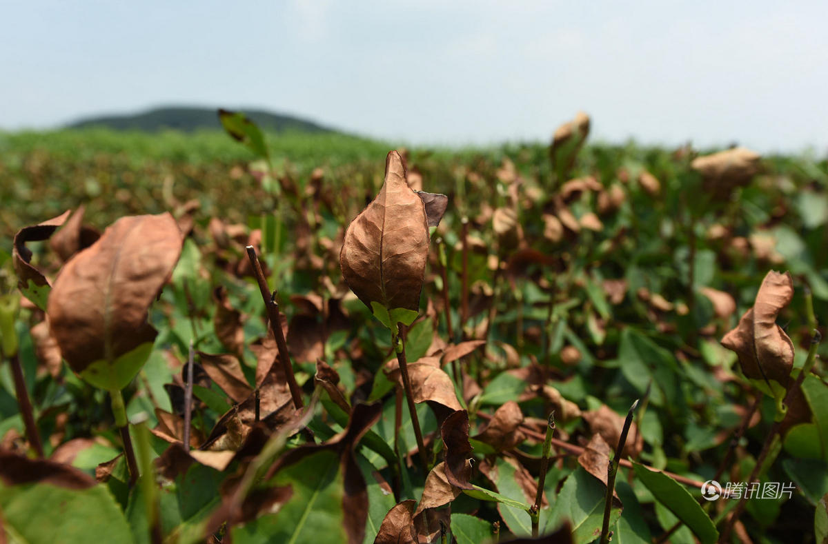 8月7日,在杭州西湖龙井一级保护区里,被高温酷暑烤焦的西湖龙井青叶。龙巍/视觉中国
