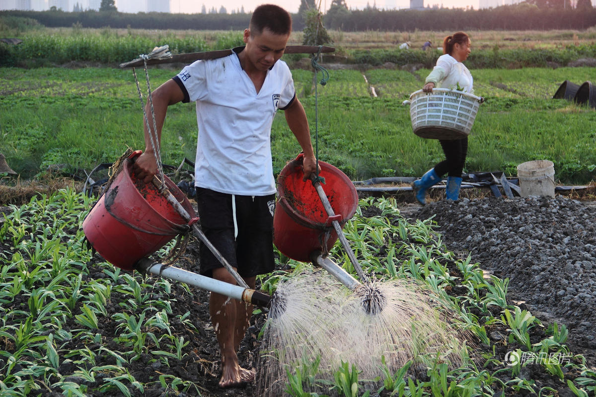 7月27日,在浙江绍兴市区蔬菜批发市场旁边菜地里,几位江西菜农正避开高温环境,抓紧时机浇水、抢收。瑞昌/视觉中国