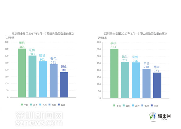 深圳巴士集团2017年从1月到7月遗失物品和认领物品数量前五名。