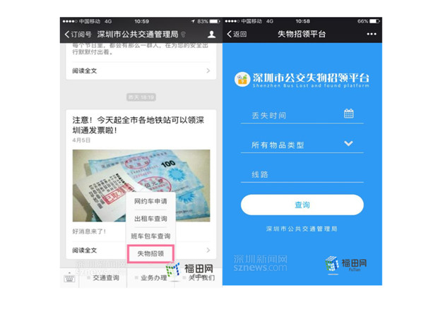 1.关注【深圳交委】或【公共交通管理局】微信公众号,下拉菜单点击【业务办理】选择【失物招领】。