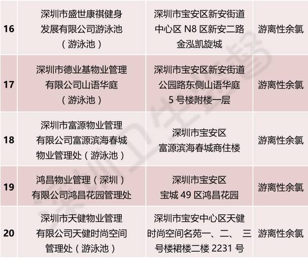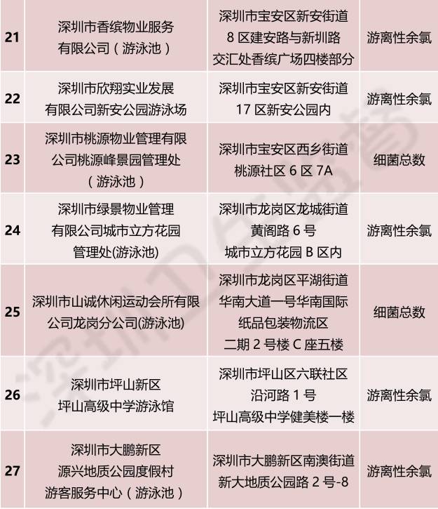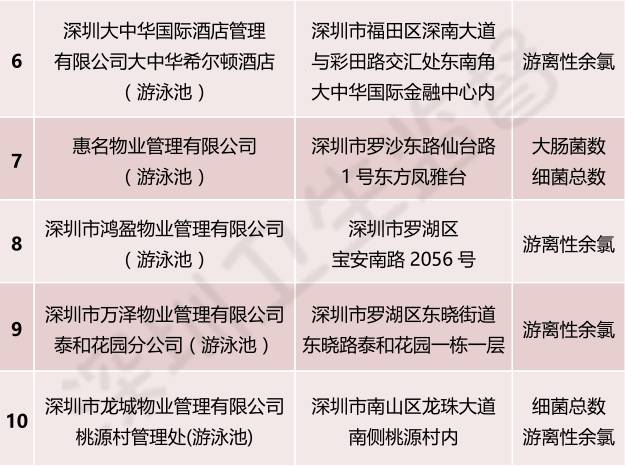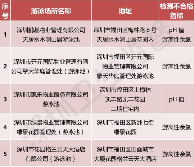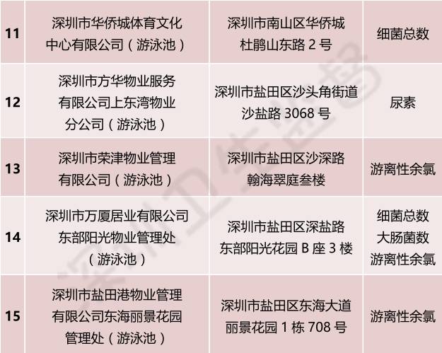 深圳新闻网讯 (记者 许可馨) "深圳卫生监督"微信公众号发文《快看!官方独家:深圳近800家泳池水质抽检报告全公开!》,其中,南山区有5家游泳场所水质抽检结果不合格,全文如下:
