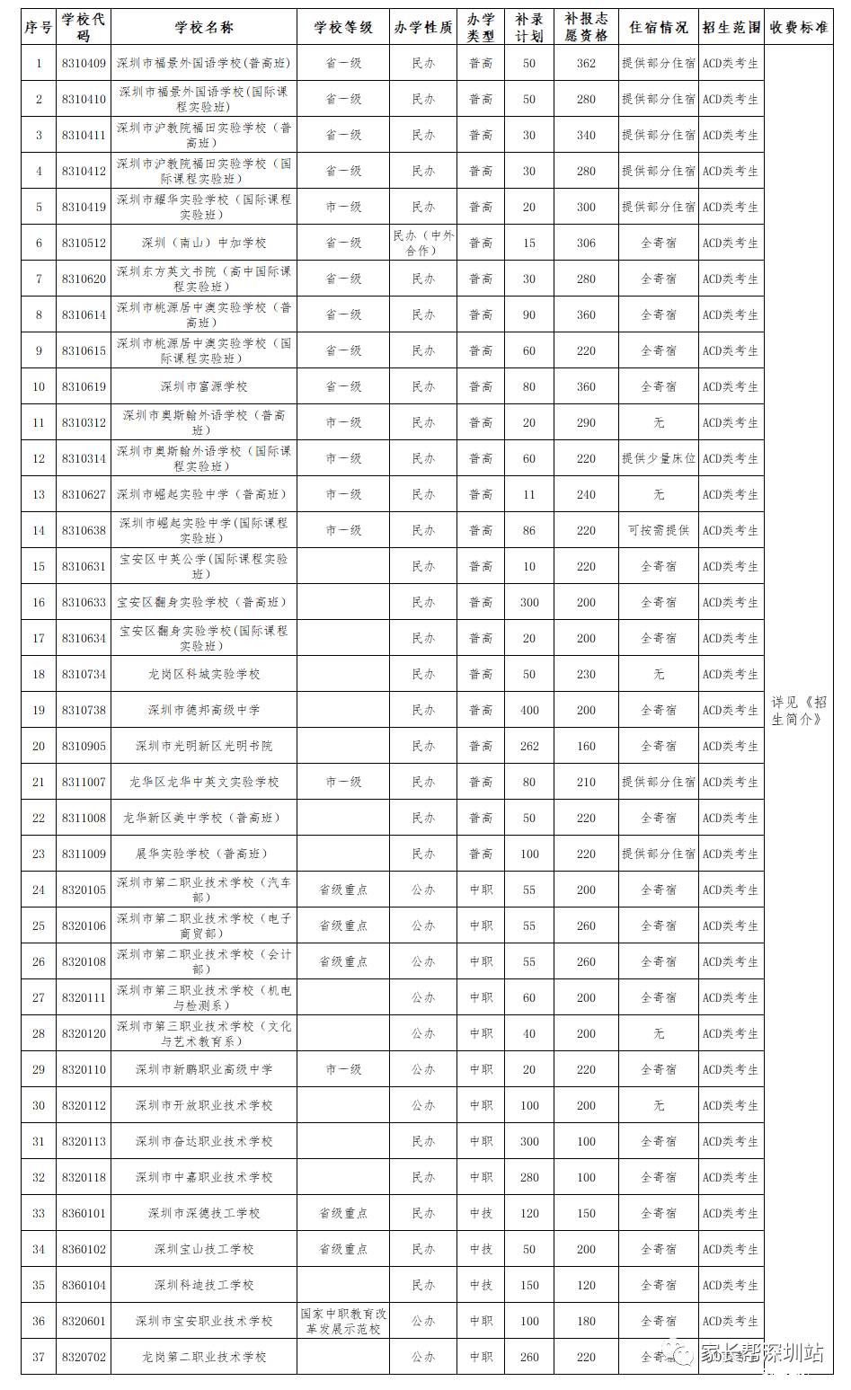 4. 表中招生范围栏内的A、C、D类是指考生户籍类别。其中:A类指具有深圳户籍的考生;C类指享受市政府优惠政策人员的子女;D类指除A、C类考生外,符合参加统一划线录取条件的考生。