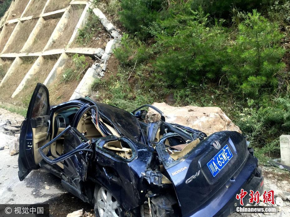 图为九寨沟漳扎镇道路上被巨石砸中的汽车。截至9日13时,经初步核查,地震已致19人遇难(其中游客8人,本地群众2人,身份不明9人),收治伤员247人(含1名法国籍、1名加拿大籍)。遇难游客遗体已转运至县殡仪馆,死亡和受伤主要发生在漳扎镇辖区内。郑磊、李陶 摄 图片来源:视觉中国