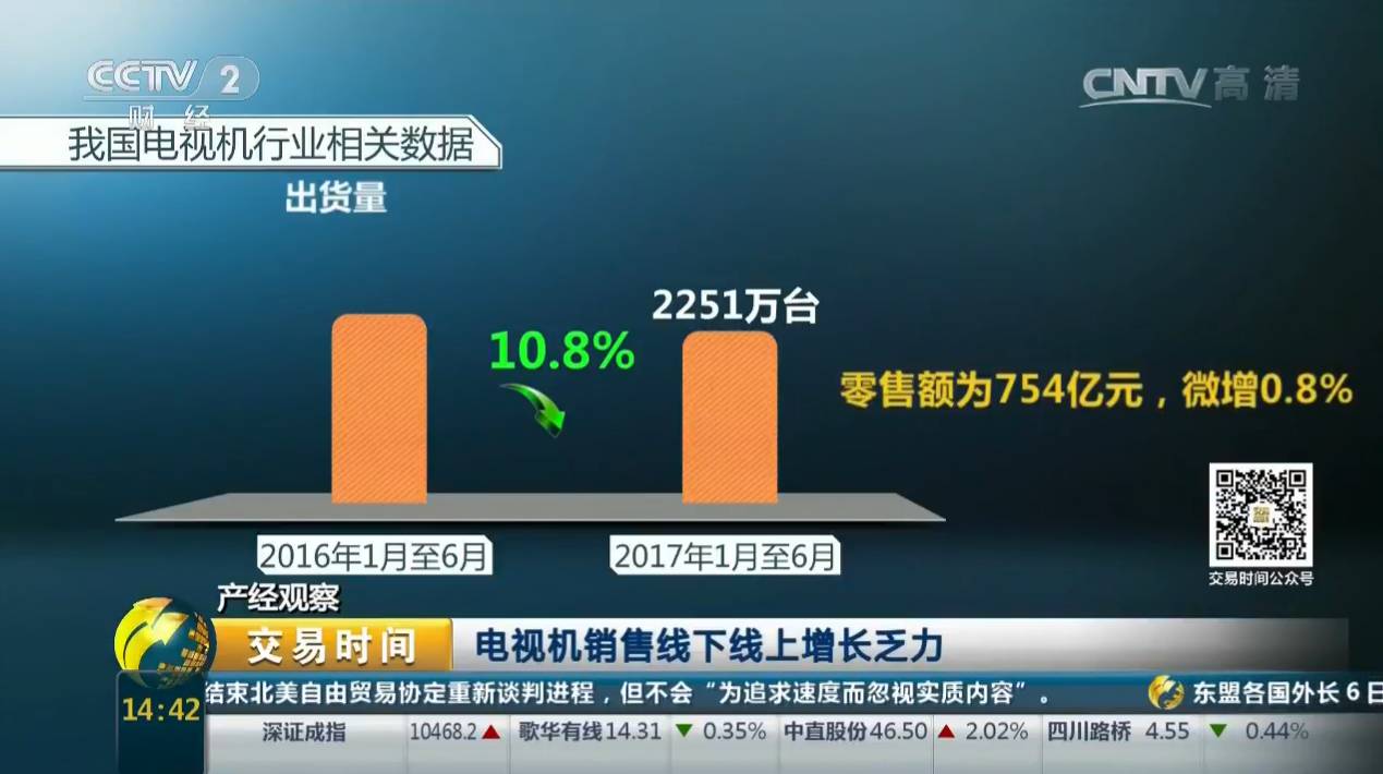 根据第三方市场调查公司中怡康监测的数据显示,2017年上半年,中国彩电市场出货量为2251万台,同比降幅达10.8%;零售额为754亿元,微增0.8%,整体呈现量降额增的态势。