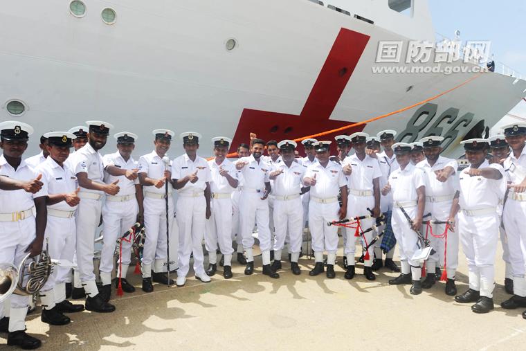 8月9日,在斯里兰卡科伦坡港码头,斯里兰卡海军军乐队队员以和平方舟为背景合影留念。江山 摄