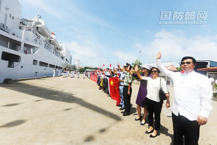 8月9日,在斯里兰卡科伦坡港码头,中国驻斯里兰卡大使易先良(右一)等送行人群向和平方舟任务官兵挥手告别。江山 摄