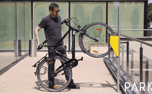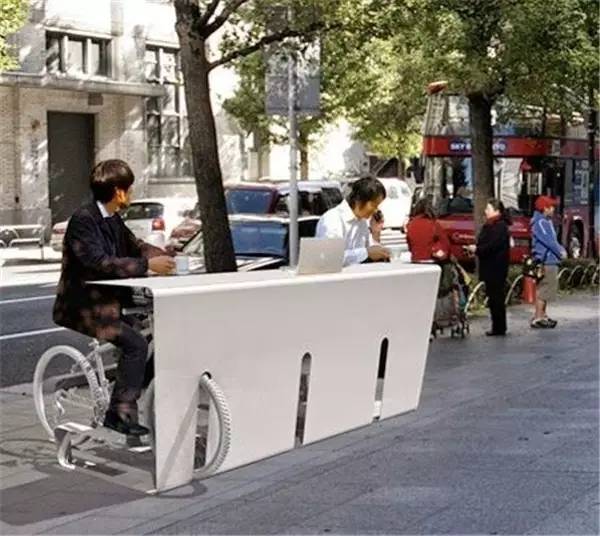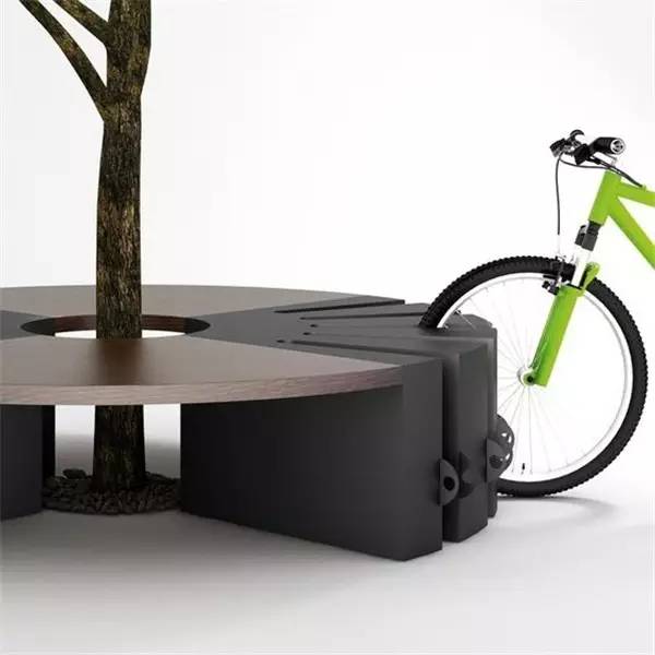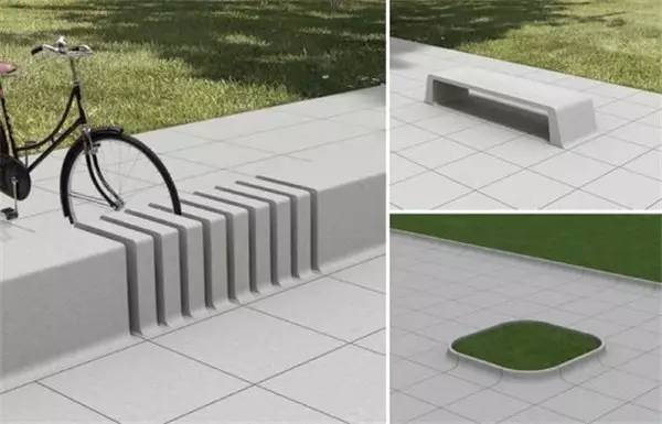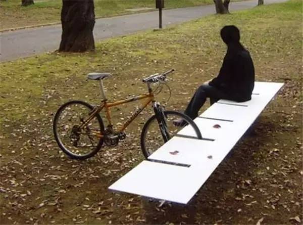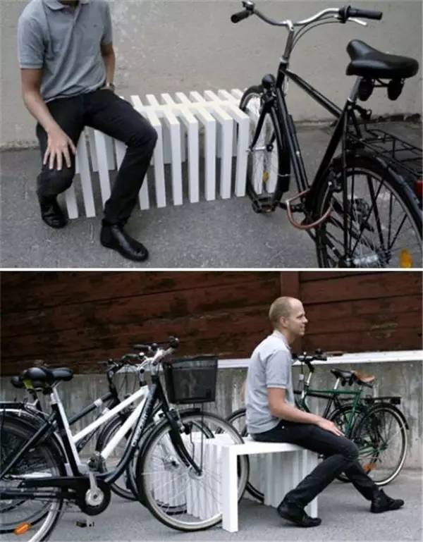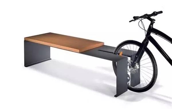 很多自行车架还融入到了其他功能中,譬如兼具停车功能的户外坐具——
