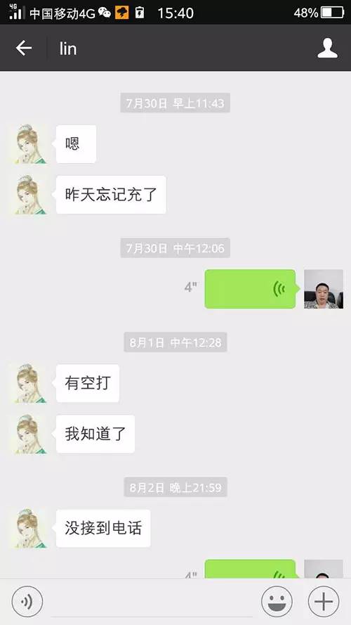 从7月12日开始,林华蓉从没有接过林孝俊的微信视频或语音聊天,每次回话都会在提问后的一天甚至好几天后回复。