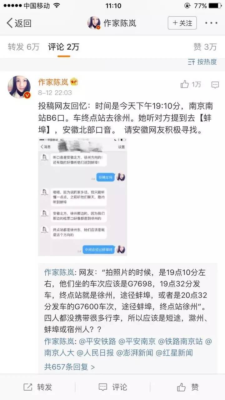 今天08:18,@南京铁路公安处南京南所官微回复了@作家陈岚,表示已经展开调查,请知情人提供相关情况。调查情况会及时公布。