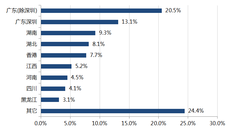 广东籍(含深圳)的购房者以33.6%的绝对优势拔得头筹,近7成房产为非广东籍的客户购得。其中,湖南、湖北分列二、三位,合计贡献17.4%,第四名是老牌买手香港,占得7.7%。比较突出的还有江西、四川这些南部内陆省份,而北部也有河南、黑龙江占得一席之地。