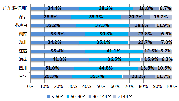整体来看,广东省(除深圳)、两湖、江西、河南等地的客户更倾向于购置60平以下的物业;而深圳本地和港澳台客户对大户型的需求高,在144平以上物业的购置中表现突出。