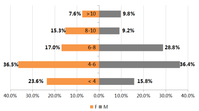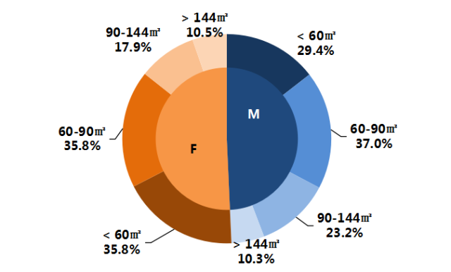 细分下来,这个差异主要体现在不同性别客户在购置60平以下物业上的表现不同,有35.8%的女性偏好面积此类物业,明显高过男性的29.4%。相应的,对于面积在90-144平之间物业的购置需求,男性23.2%的比例则高于女性的17.9%。