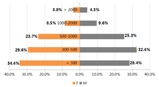 整体而言,女性选择不同类型总价物业的倾向呈完美的金字塔模式,而男性在不同区间的占比相差相对小。