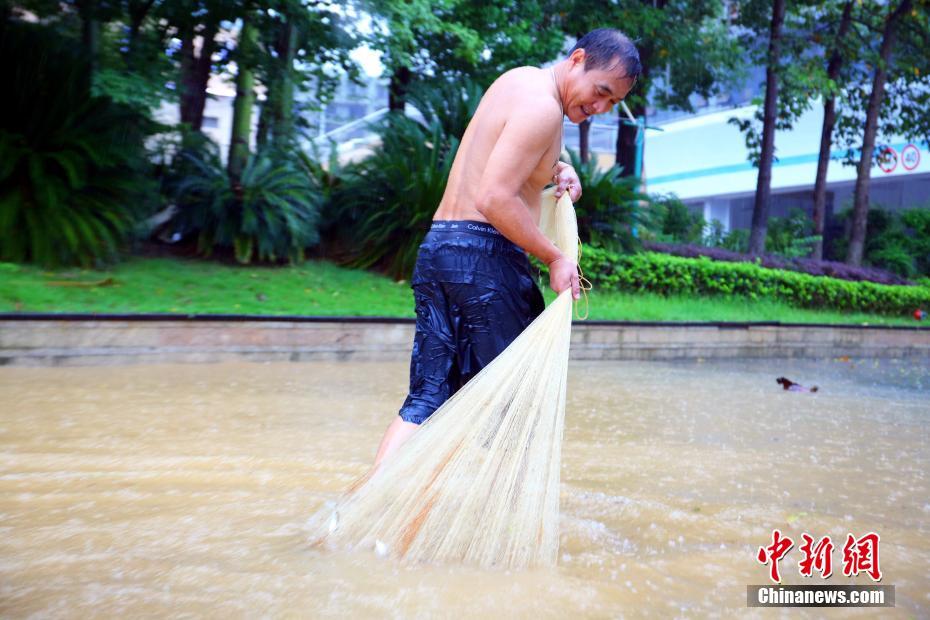 雨水冲击广西河流水位上涨 民众雨中网鱼