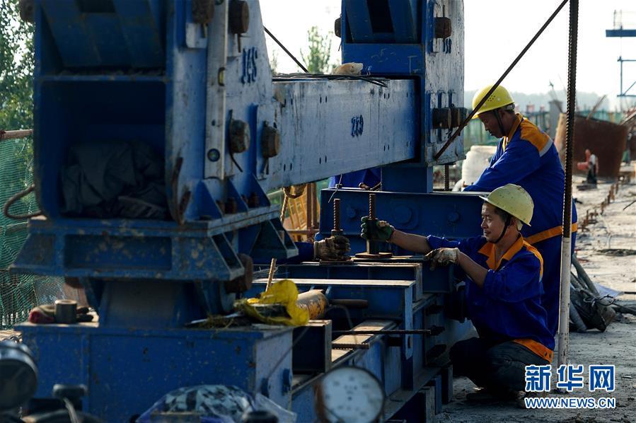 8月15日,中铁七局郑州公司的施工人员在郑阜高铁先开段跨商周高速连续梁施工现场作业。新华社记者 李安 摄