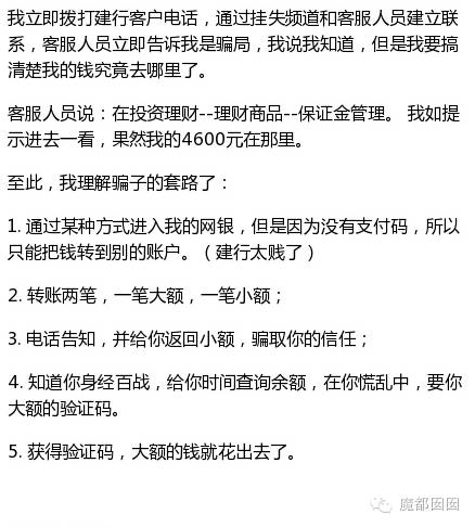 3、你转钱到投资理财账户的时候银行肯定会给你发信息,告诉你钱转出去了,这是正常的。但是仅仅是告诉你钱转出去的,转到哪里去了,银行并未告诉你!如果在这步银行多写几个字,写明转出去的目的地,这个骗术就很难成功了!
