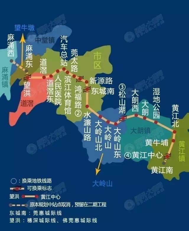 望洪站——道滘站——道滘东站——人民医院站——汽车总站——滨江体育馆站——莞太路站——鸿福路站——新源路站——东城南站——水濂山站——大岭山北站——大岭山站——大岭山东站——松山湖站——大朗西站——大朗站——湿地公园站——黄江北站——黄牛埔站——黄江中心站