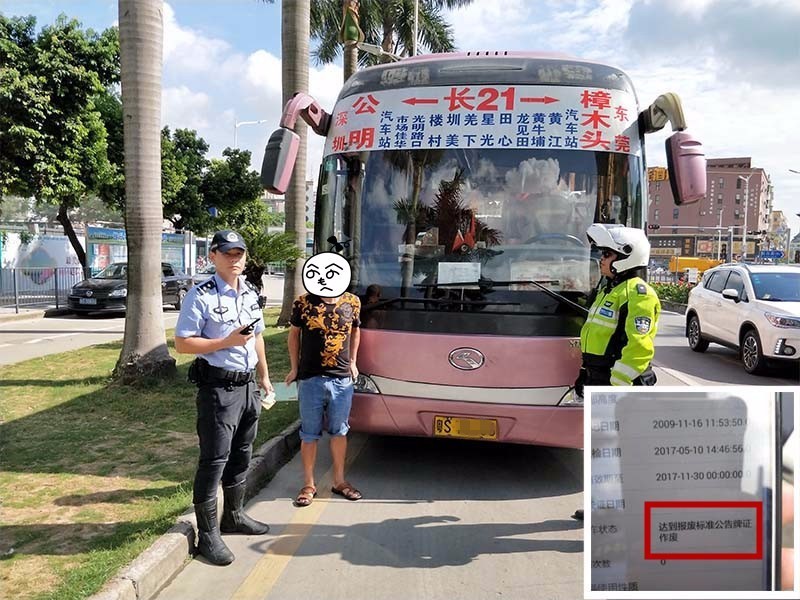 2017年8月16日上午,深圳交警光明大队铁骑接到大队情报中心指令,一辆达到报废标准的粤S号牌长途大巴驶入光明辖区,铁骑民警接到指令后立即出动,于上午9点30分许,在光明新区松白路公明汽车站路段将该车查获,并现场依法对该车进行查扣。