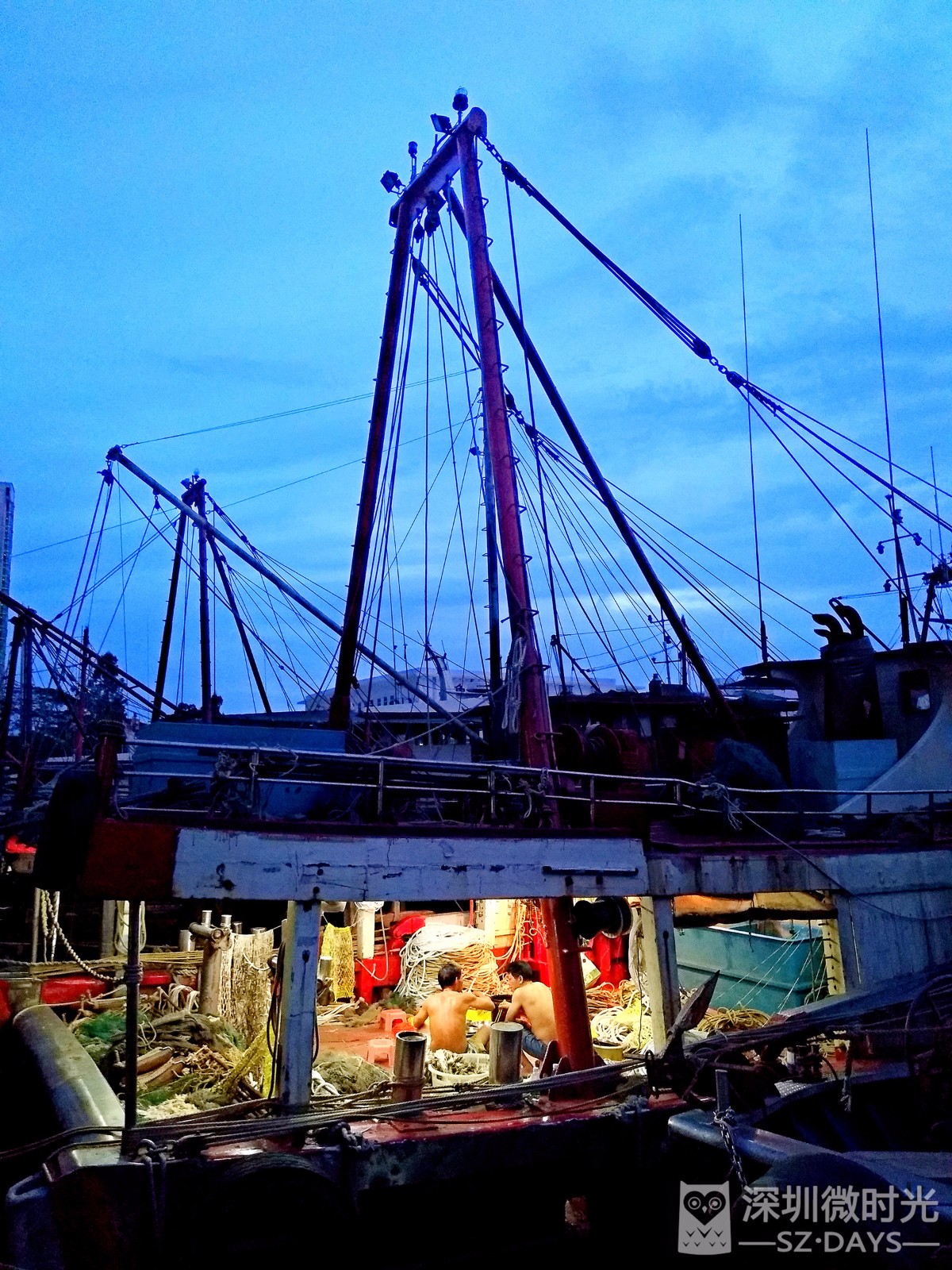 七点左右天色已经暗了下来,可以看到不少渔船上亮着灯,渔民们三三两两地坐在一起,估计是商讨一些明天开渔的事宜。