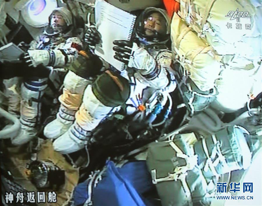 这是2016年11月18日在北京航天飞行控制中心大屏幕拍摄的神舟十一号飞船返回舱内的画面。2016年11月18日13时59分,神舟十一号飞船返回舱在内蒙古中部预定区域成功着陆,执行飞行任务的航天员景海鹏、陈冬身体状态良好,天宫二号与神舟十一号载人飞行任务取得圆满成功。新华社记者才扬 摄